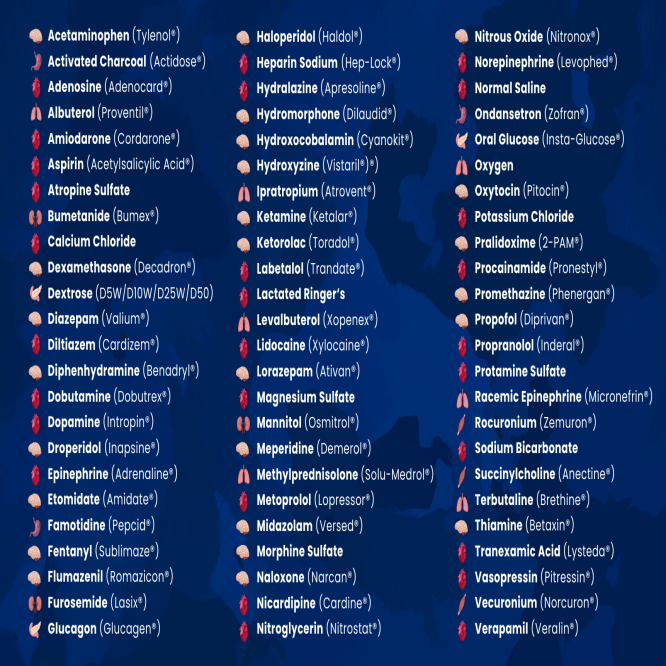 Every critical EMS med with dosages, contraindications, and protocols included.