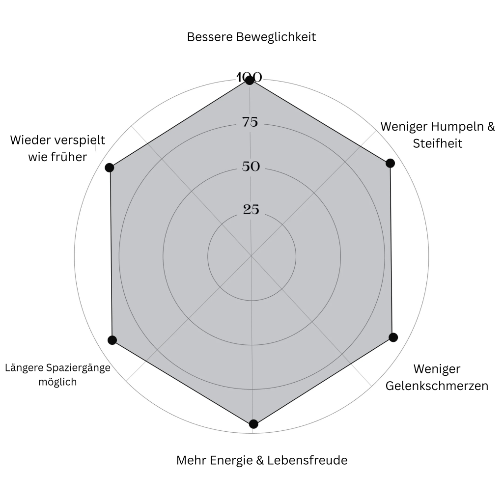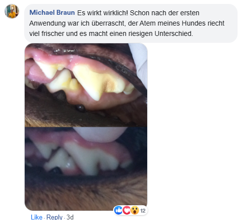 Doch nach sechs Wochen war der Unterschied nicht zu übersehen. Sein Atem riecht neutral, das Zahnfleisch ist wieder rosa, die braunen Ränder an den Zähnen verschwinden und er kann wieder problemlos kauen. Er frisst wieder mit Appetit, kaut begeistert seine Spielzeuge und lässt sich endlich wieder küssen.