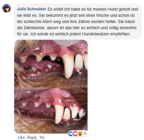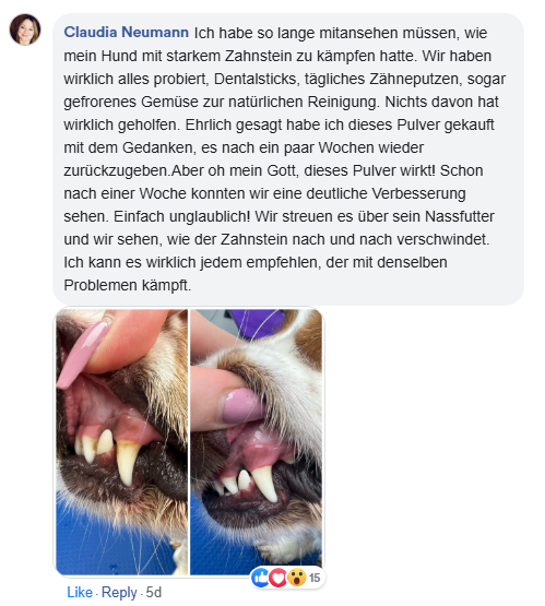 Mein Hund hatte über längere Zeit extremen Mundgeruch, und wir waren ehrlich gesagt überzeugt, dass so ein Pulver nicht wirklich helfen kann.
