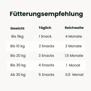 Die Snacks sollten täglich gegeben werden – idealerweise immer zur gleichen Tageszeit. Die genaue Menge richtet sich nach dem Gewicht deines Hundes und steht auf der Verpackung oder oben unter „Fütterungsempfehlung“. Für eine spürbare Wirkung ist es wichtig, dass du die Snacks langfristig und konsequent fütterst.